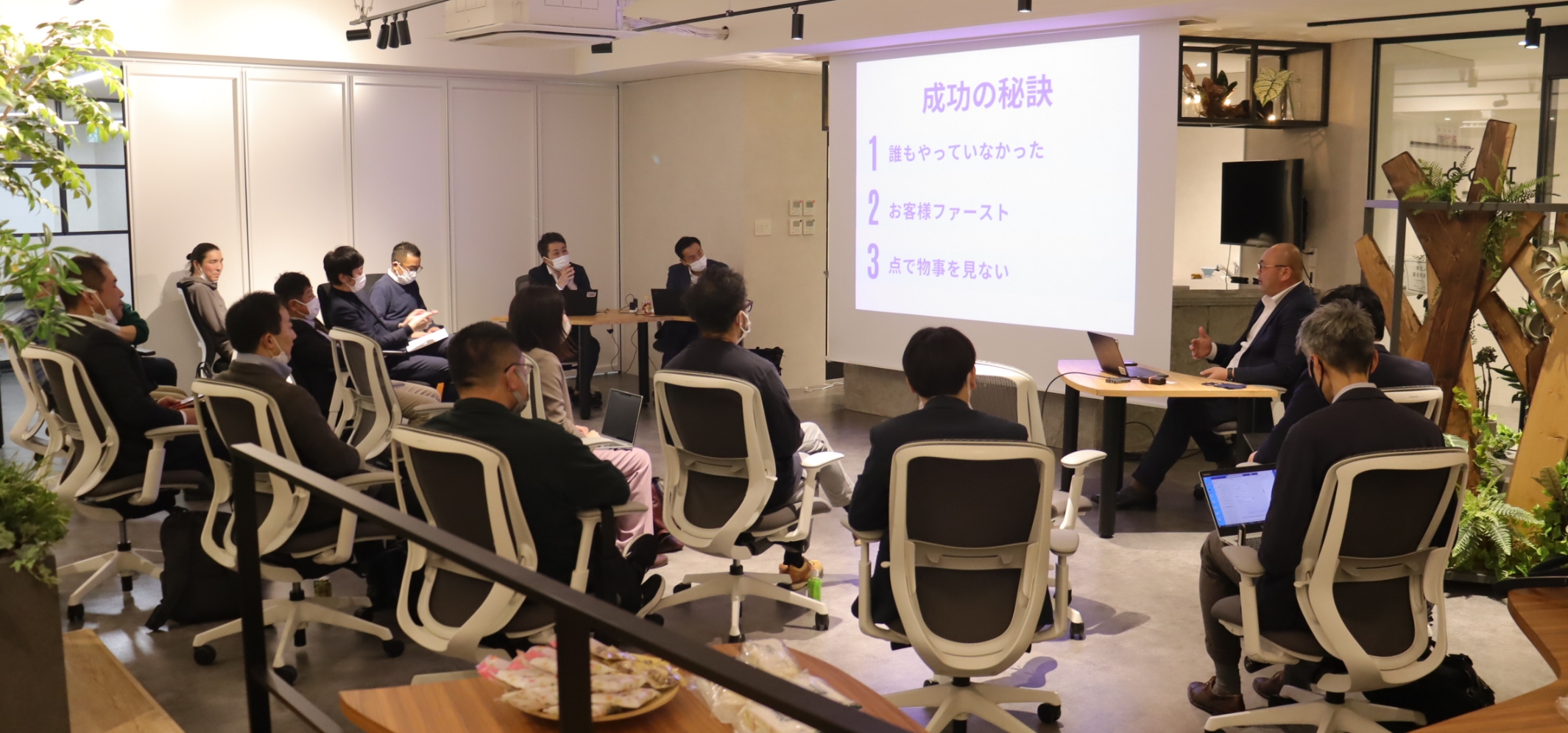 定禅寺ヒルズの5階で活発な議論が繰り広げられています。弊社代表の齋藤と中小企業の経営者たちが、SKグループの新規事業(「Pocci!」)に関して本気の雑談をしている風景です。この日は、成功・失敗事業を共有し合うイベントが開催され、参加者は自由に意見交換をしていました。