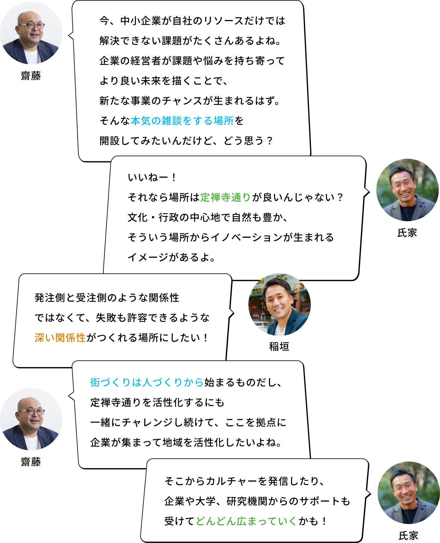 それぞれが自らの道を駆け抜ける中、稲垣社長が形成していた600名のフリーランスが集まるプラットフォームに度々足を運んでいた齋藤は、新しい事業やパートナーシップが創出される様子から着想を得て、「中小企業とフリーランスが一緒にビジネスをつくることで新しい可能性が生まれるのではないか」と考えます。さらに、若手社員から提案された「若手の社会人たちが価値観を共有しながら一緒に成長できるようなコミュニティをつくりたい」という新規事業案より、同じ志を持った人々が企業の枠を超え本気の雑談を行う、現在のIDOBAのアイデアが生まれました。齋藤はかつて本気の雑談で高め合ってきた2人に話を持ち掛けます。