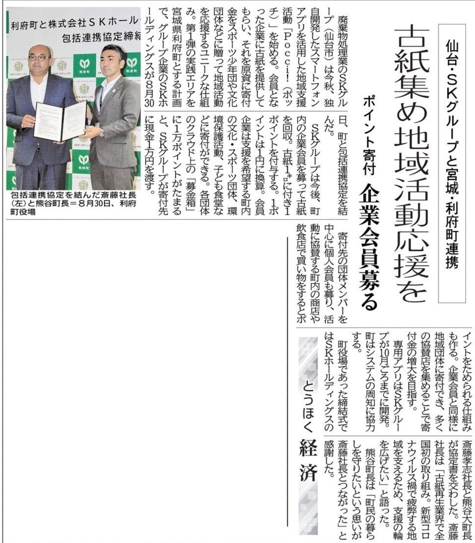 令和4年8月30日(火)、利府町役場にて行われた包括連携協定の様子が、9月1日(水)付の河北新報朝刊に掲載されました。