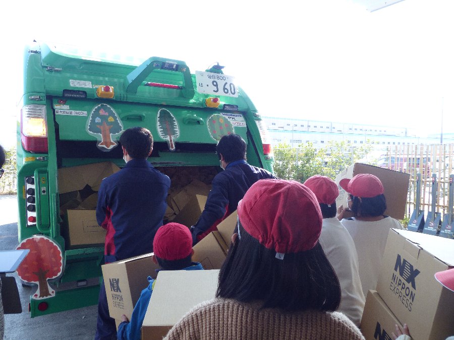 菅谷台小学校4年生の皆さんが来てくださり、イオンモール様内にある廃棄物保管庫の見学やごみ収集車への段ボール入れ体験を行い、リサイクルの大切さを学んでいただきました。