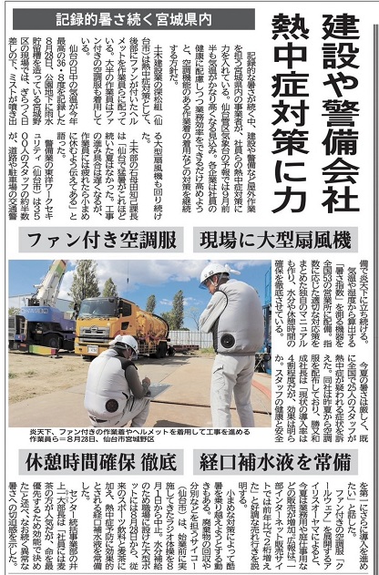 9月1日(金)付の河北新報に弊社の熱中症対策の取り組みが記載されました。