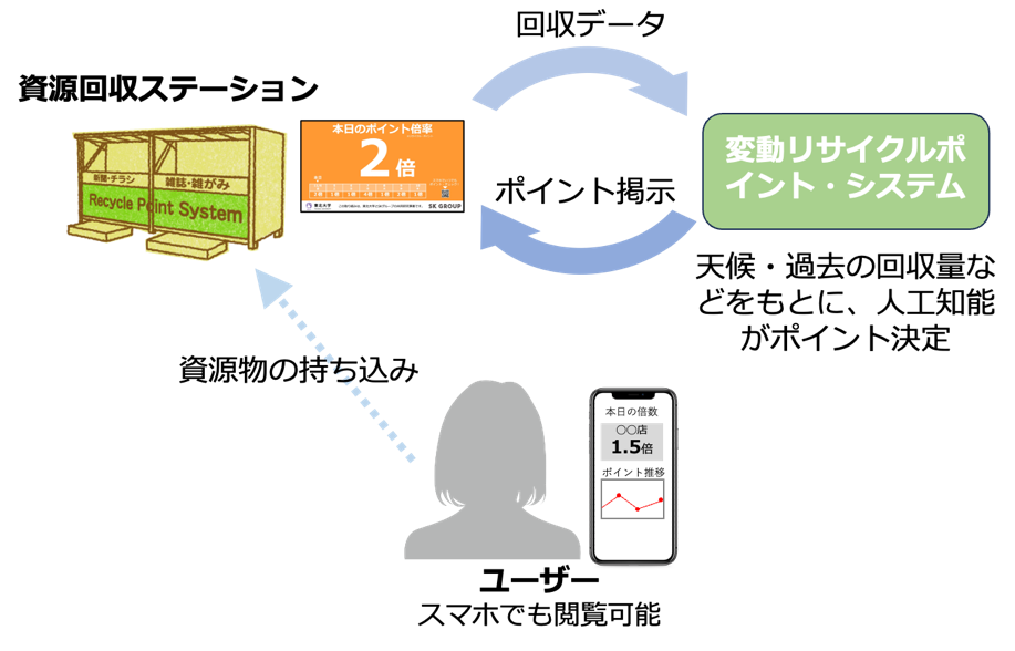 本実証実験では、新時代の資源回収ステーションの構築に向け、変動リサイクルポイント・システムの有効性を検証します。具体的には、ステーションが記録した回収データなどから人工知能が消費者のリサイクル行動を学習・予測し、刻々と変化する資源回収ニーズに応じて適切なポイント付与率を提示することにより、ステーションの稼働状況を適切に管理し、効率的かつ効果的な回収事業の実現を目指します。