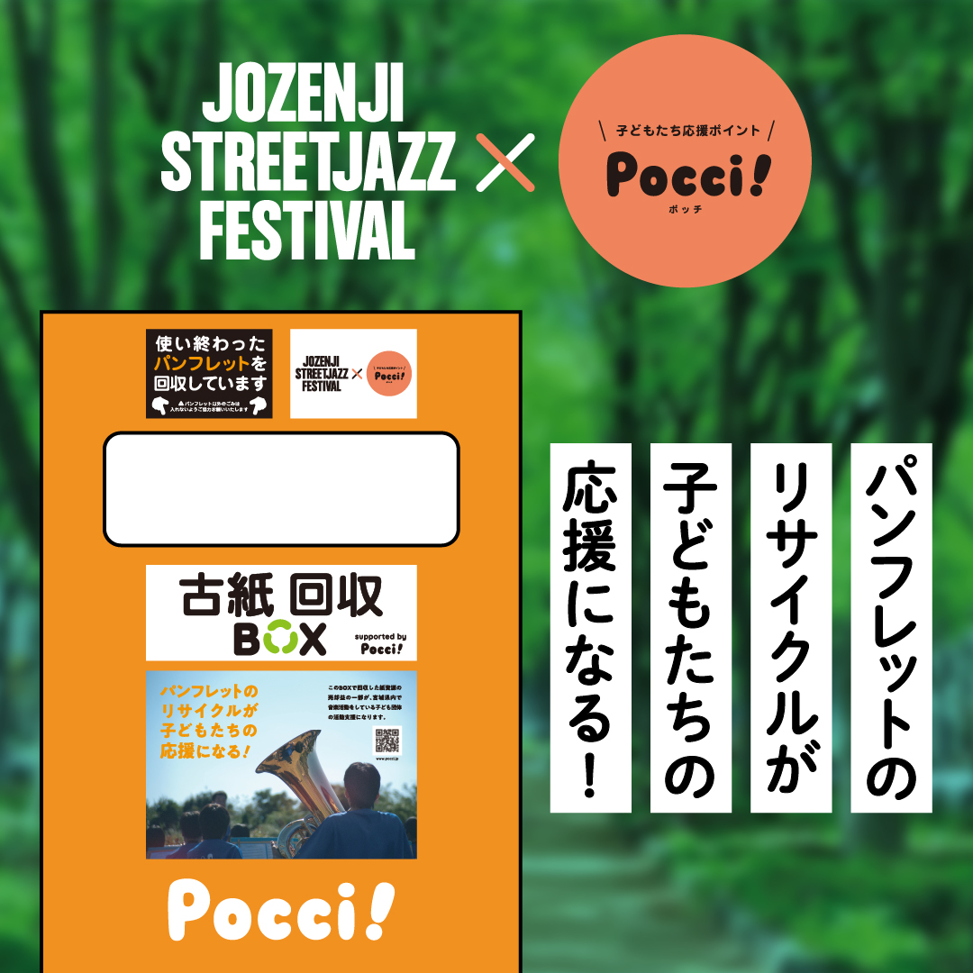 イベント当日、会場に古紙回収BOXを設置し、見終わったパンフレットを中心とした古紙を回収。その古紙売却益の一部を、Pocci!に加入している音楽活動団体への支援とさせていただきます。
