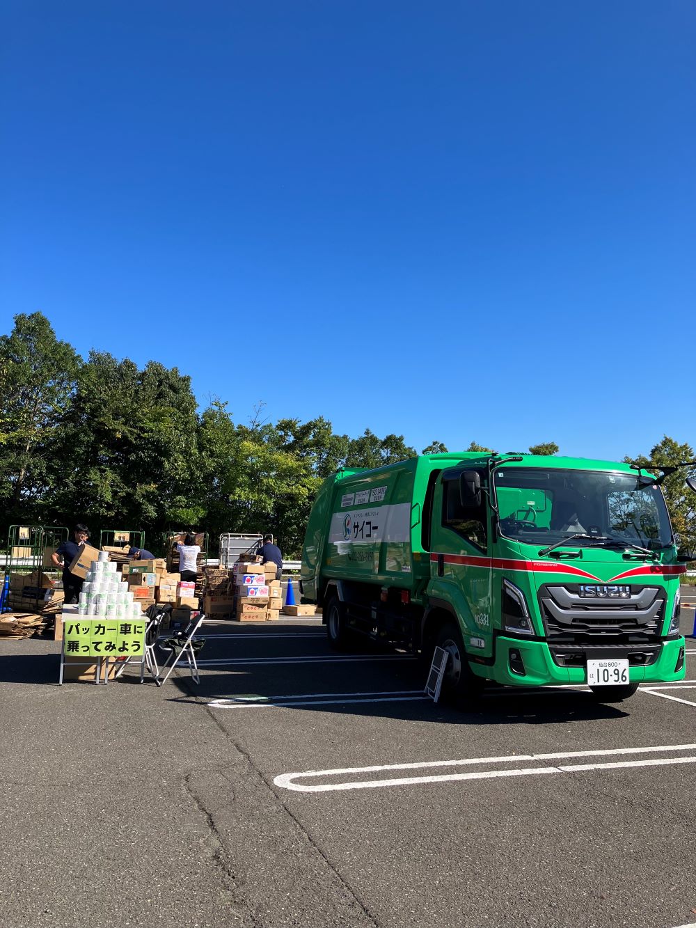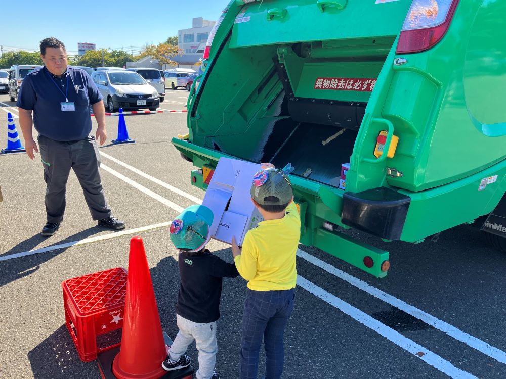 毎年お声がけいただいているこちらのイベントでは、各所でご好評いただいている資源物収集車への「ダンボール投げ入れ体験」と「乗車体験&記念撮影」を実施しました。