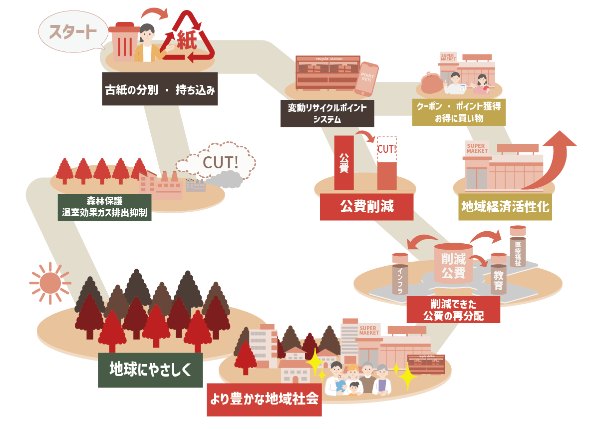 利用者のリサイクル行動は燃えるごみの量の減少、自治体の負担する焼却費用の削減につながり、加えて紙資源のリサイクルにより森林保護や温室効果ガスの排出抑制などの効果も期待されます。
