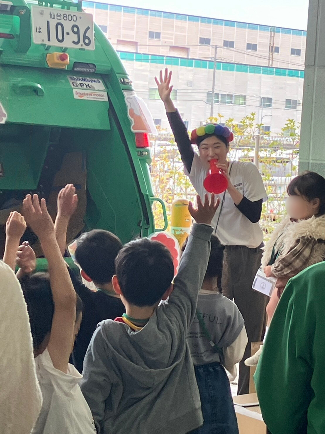 イオンモール内の各テナントから排出される廃棄物がどのように分別されているかを、実際に目で見たりクイズを通して学んでいただき、最後はパッカー車(廃棄物・資源物収集車)に実際にダンボールを投入する体験をしていただきました。
