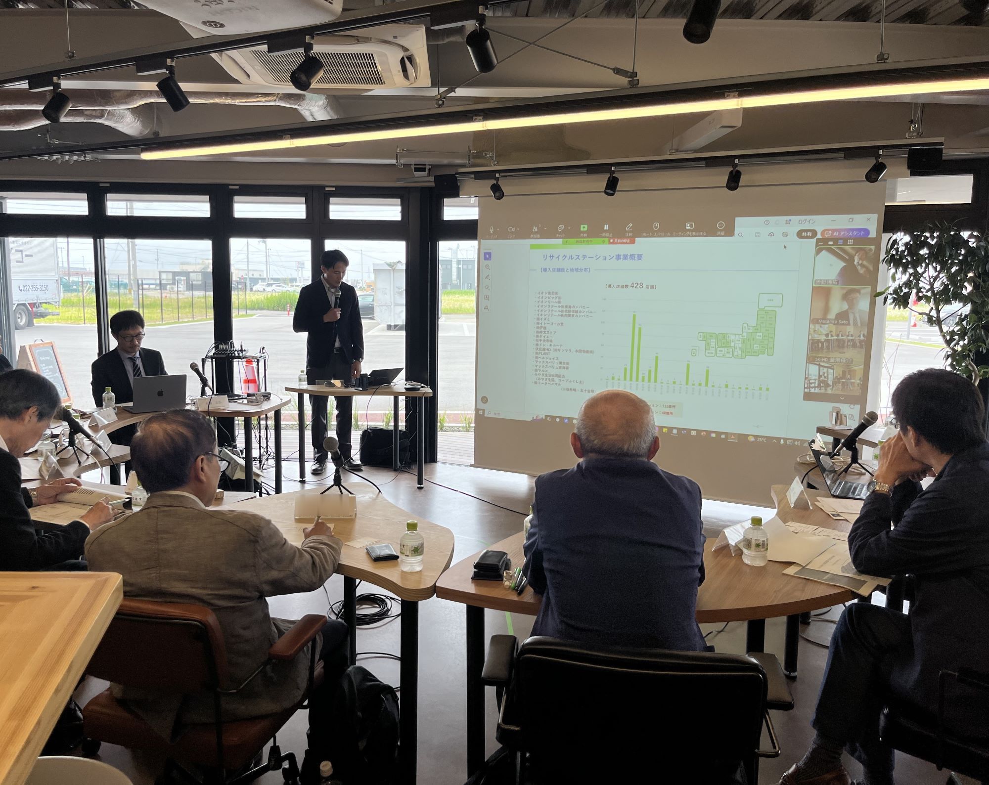 先日6月10日に「SKグループ仙台港ベース」にて開催されたキックオフ会合では、研究メンバーのほか新たにERCAプログラムオフィサー、大学、業界団体、実験の場となる地元スーパーマーケット、仙台市からそれぞれアドバイザーやオブザーバー計12名が参加。研究代表者である東北大学大学院国際文化研究科准教授 佐藤正弘 氏からの研究計画を受けての意見交換を行いました。