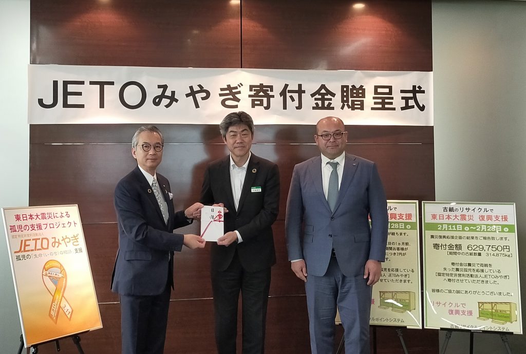 みやぎ生協34店舗、コープふくしま8店舗の古紙リサイクルポイントシステムに持ち込まれた新聞や雑誌、段ボールなどの古紙1㎏につき2円を寄付金とし、みやぎ生協は認定特定非営利法人JETO(ジェット)みやぎ(※1)へ、コープふくしまは東日本大震災ふくしまこども寄附金(※2)へ、集まった古紙量に応じて下記の金額を寄付いたしました。(コープ東北サンネット事業連合1円/kg、サイコー1円/kg)