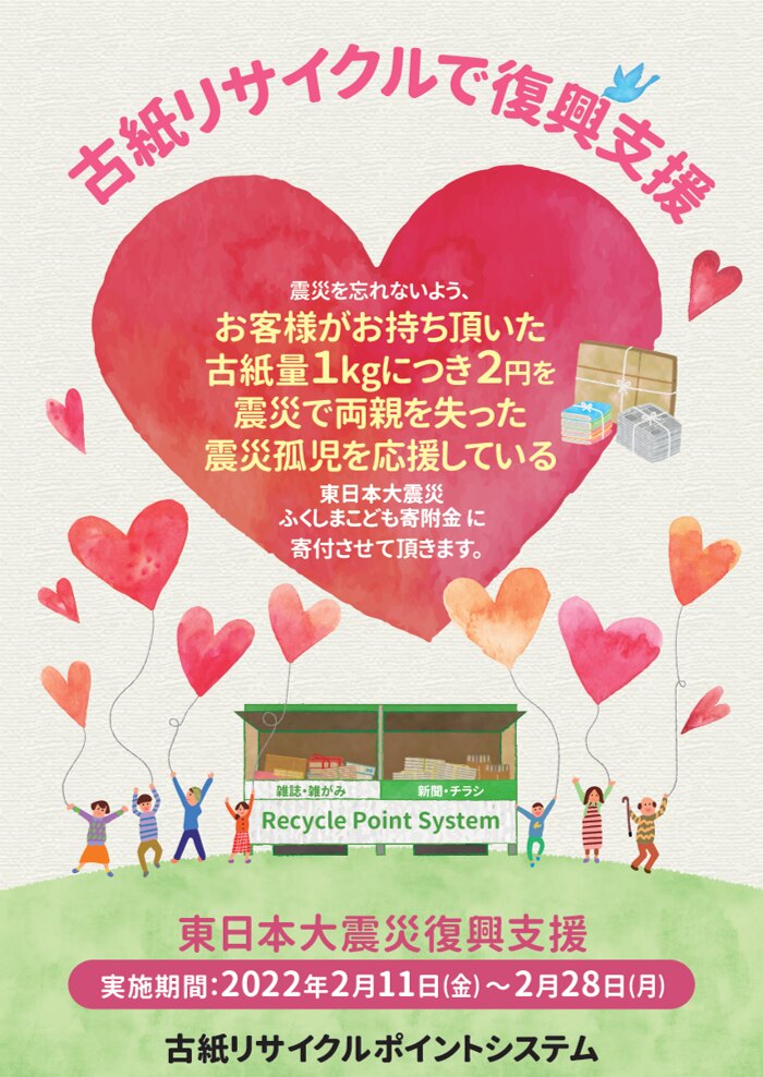 2022年2月11日~2月28日の期間中に集まった古紙の売上金の一部を寄付いたします。