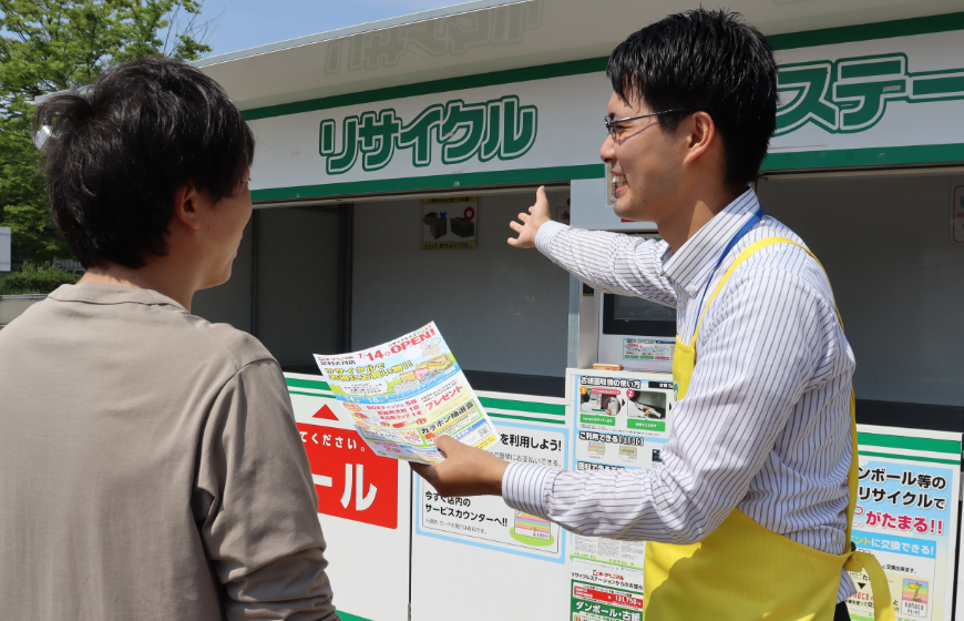 生活に浸透するエコサービスとしてリサイクルポイントシステムをより多くの方にご利用いただけるよう、様々なサービスを展開しています。定期的に開催する「ポイント2倍キャンペーン」や抽選会、大手スーパー様と共同の温泉宿泊券が当たるキャンペーンなど、社員がアイデアを出し合い企画しています。店頭ポスターの作成やサイト運営なども社員によるものです。